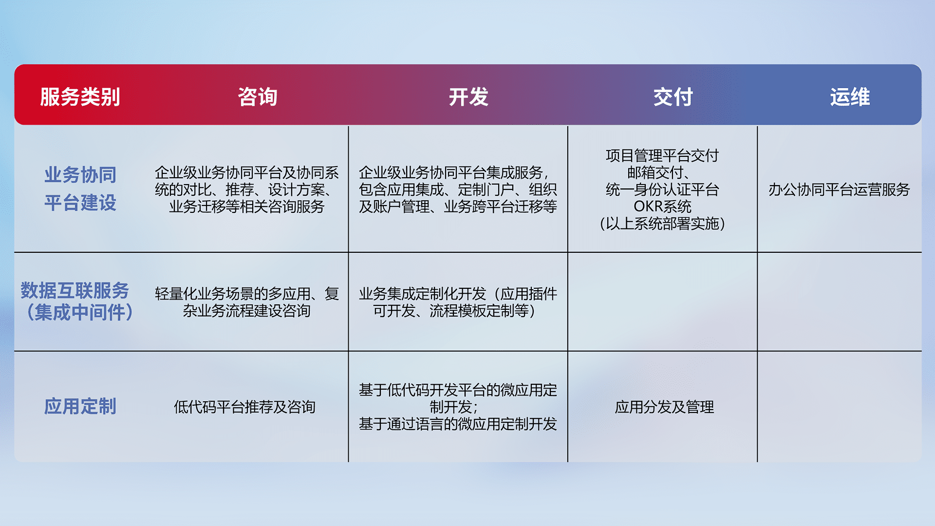 针对钉钉、、、、企微、、IDaas等平台级产品提供产品的规划、、、方案、、、、交付、、、、定制化开发等服务,,,实现如统一协同办公、、、、智能客户服务、、混合会议管理、、、、智能数据查询、、等业务场景,,,,实现数字化转型。。