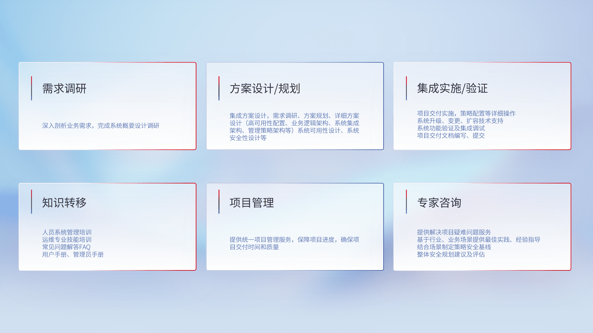 针对客户行业特性,,,将宏观的安全战略和需求,,,通过专业的交付服务,,,实现项目落地,,为客户提供标准规范的集成交付服务。。。。
